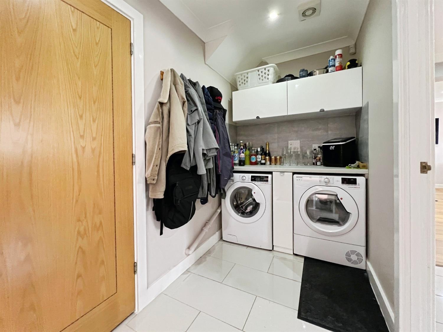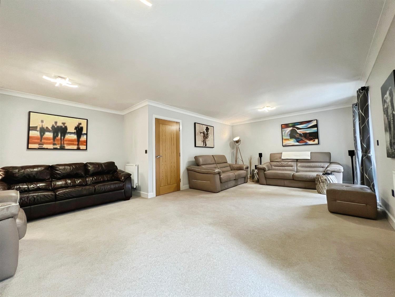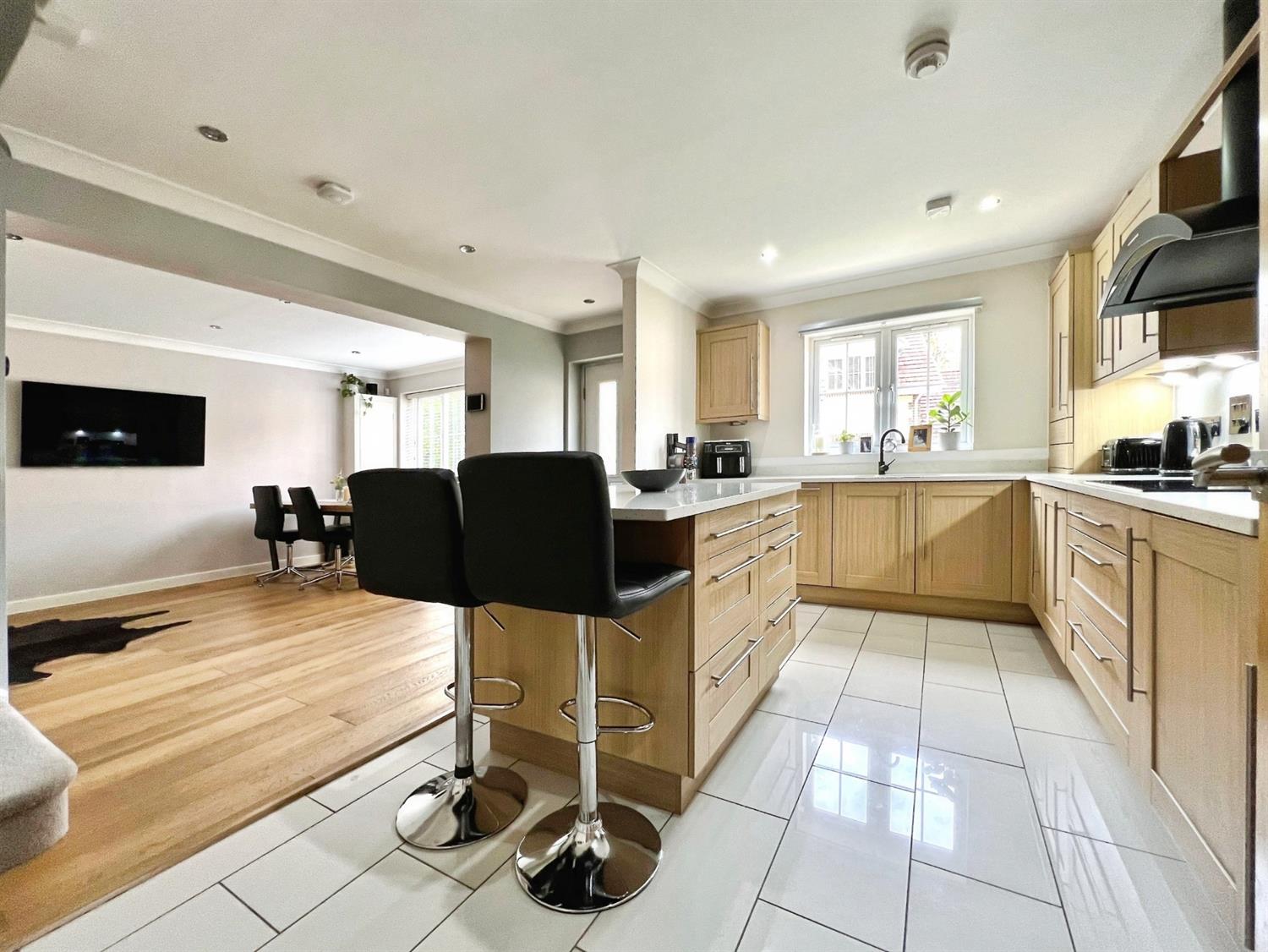 The stunning open-plan kitchen is a showpiece in itself, finished to the highest standard. It features an impressive kitchen island at its centre, offering ample workspace and sociable seating. Natural light pours in, illuminating every corner, while thoughtful touches such as a practical utility room and a separate drying room enhance both convenience and functionality.