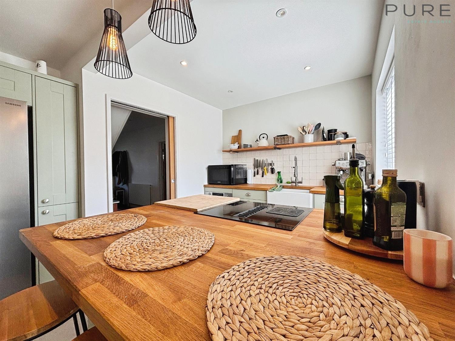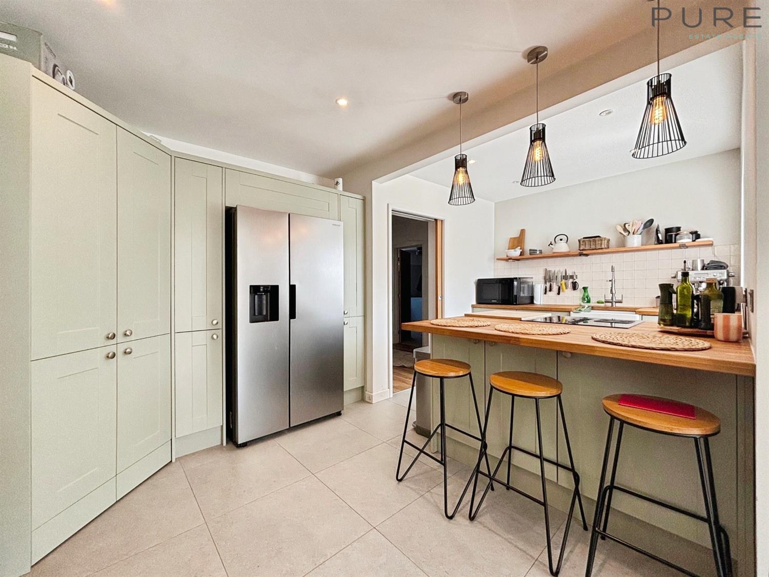An open-plan reception room features large windows with views over the garden and direct access outside, creating a bright and flexible living and dining space. The adjoining open-plan kitchen includes wood countertops, a breakfast bar and generous natural light, providing an attractive everyday cooking and social area.