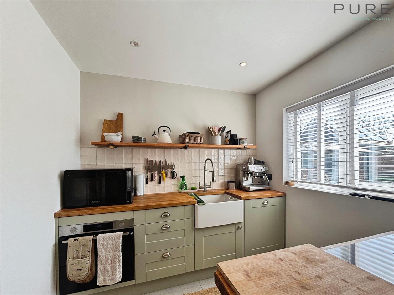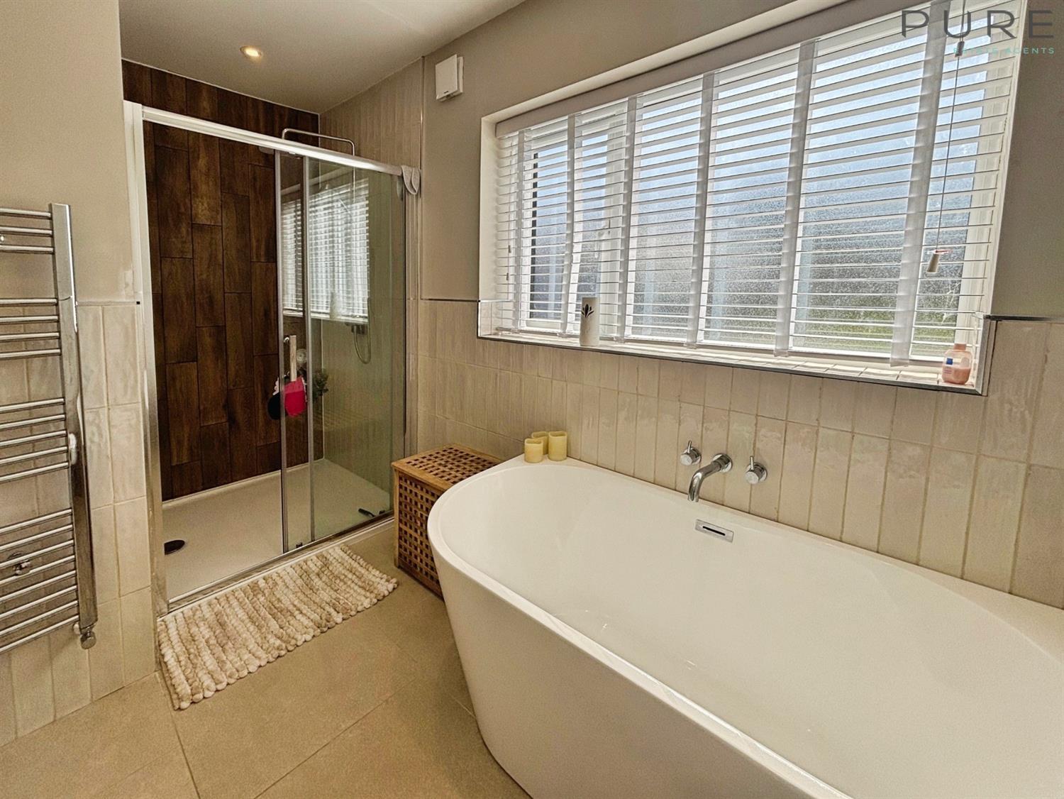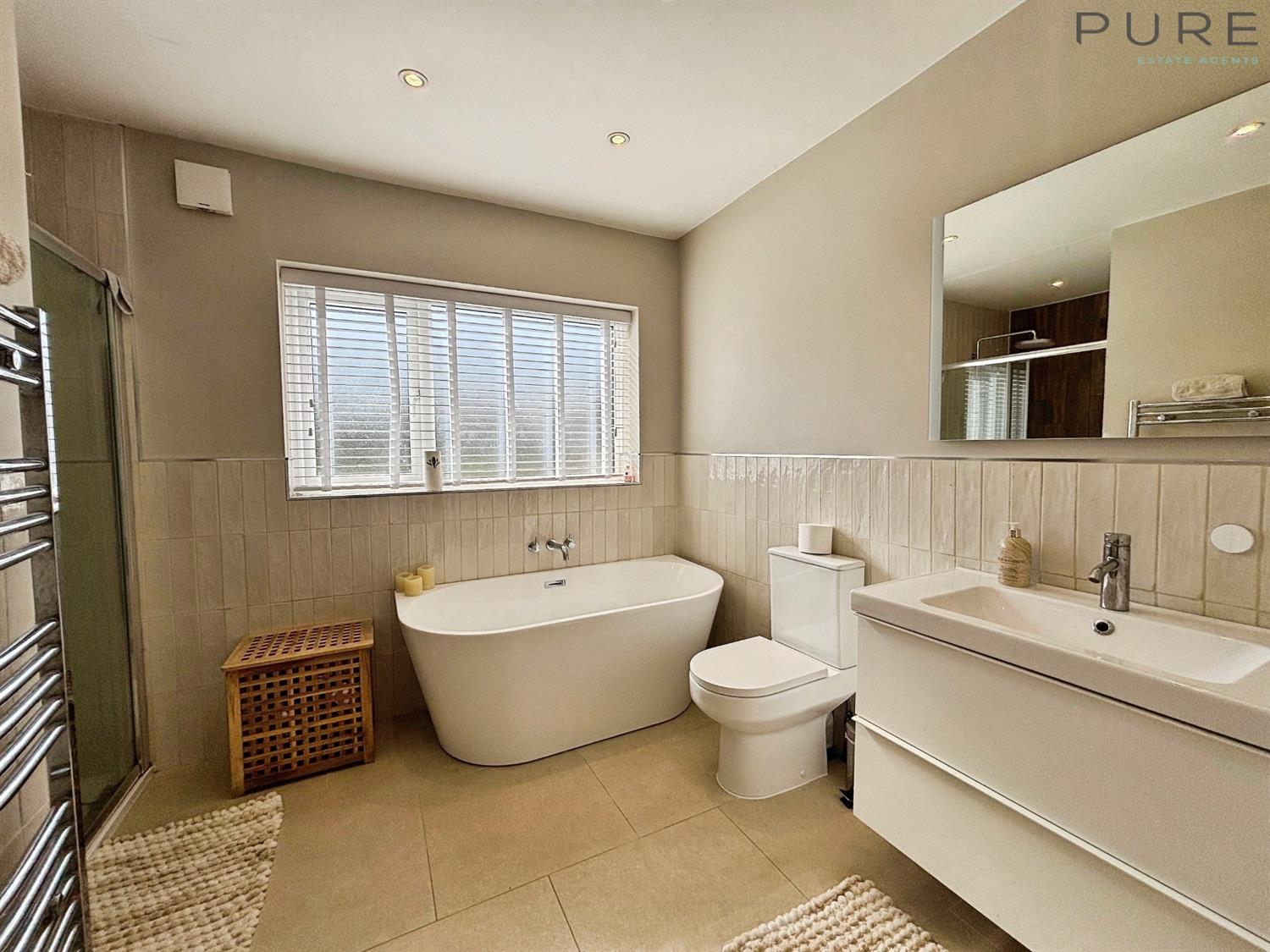 The accommodation offers a master bedroom and two further double bedrooms, one benefiting from built-in wardrobes. The family bathroom is fitted with a separate bath, rain shower and heated towel rail.