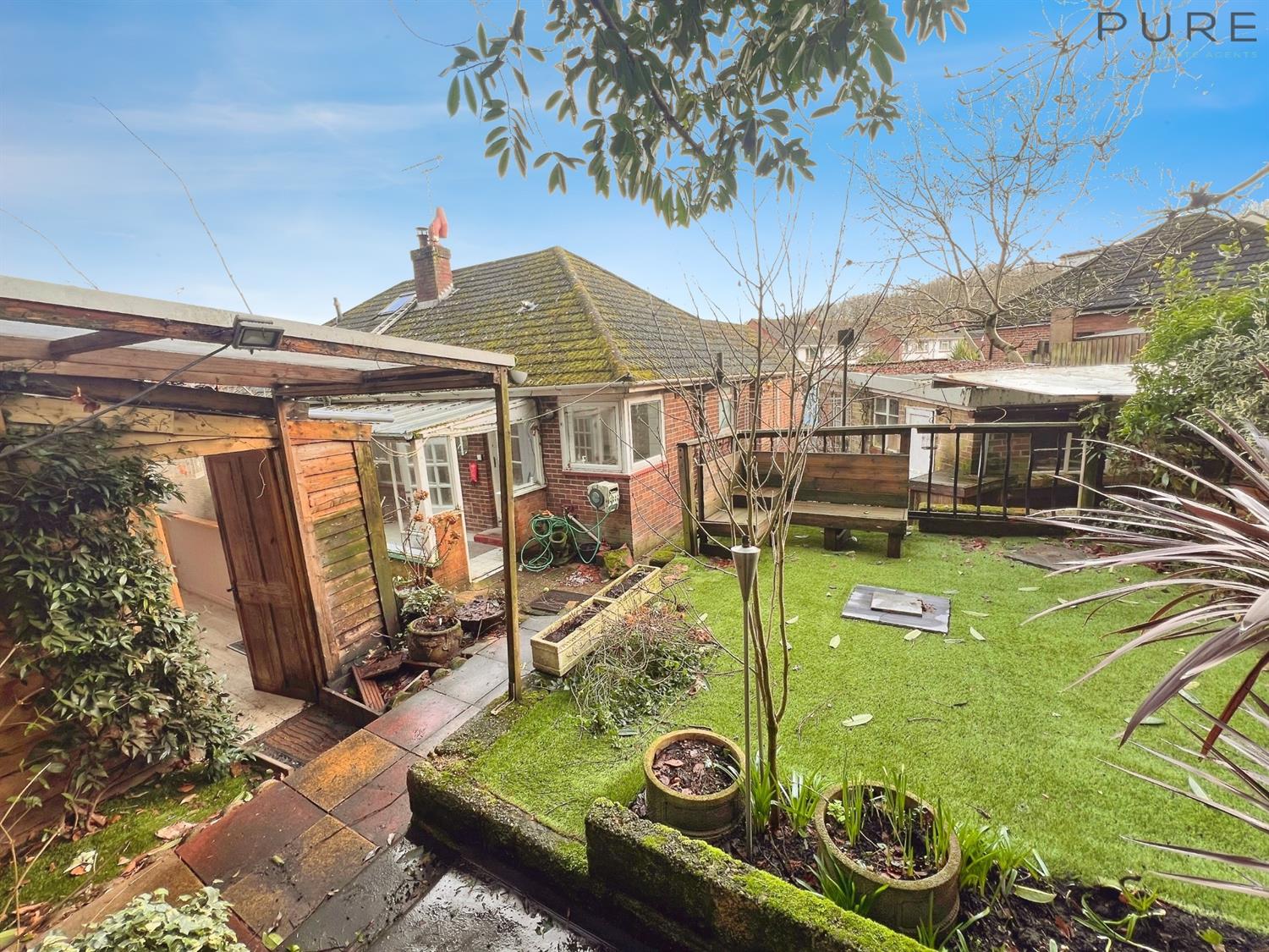 The accommodation includes two double bedrooms, one reception room, a conservatory and one bathroom. Please note the loft has been converted, but does not have a staircase and therefore cannot be used as room currently. There is a large garden, ideal for those looking for generous outdoor space, together with driveway parking and a single garage. The bungalow also occupies a corner plot and benefits from large outbuildings, offering useful storage or potential for workshop space, subject to any necessary consents. The property is offered with no chain.