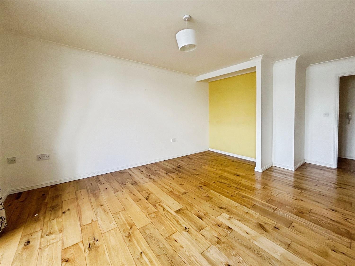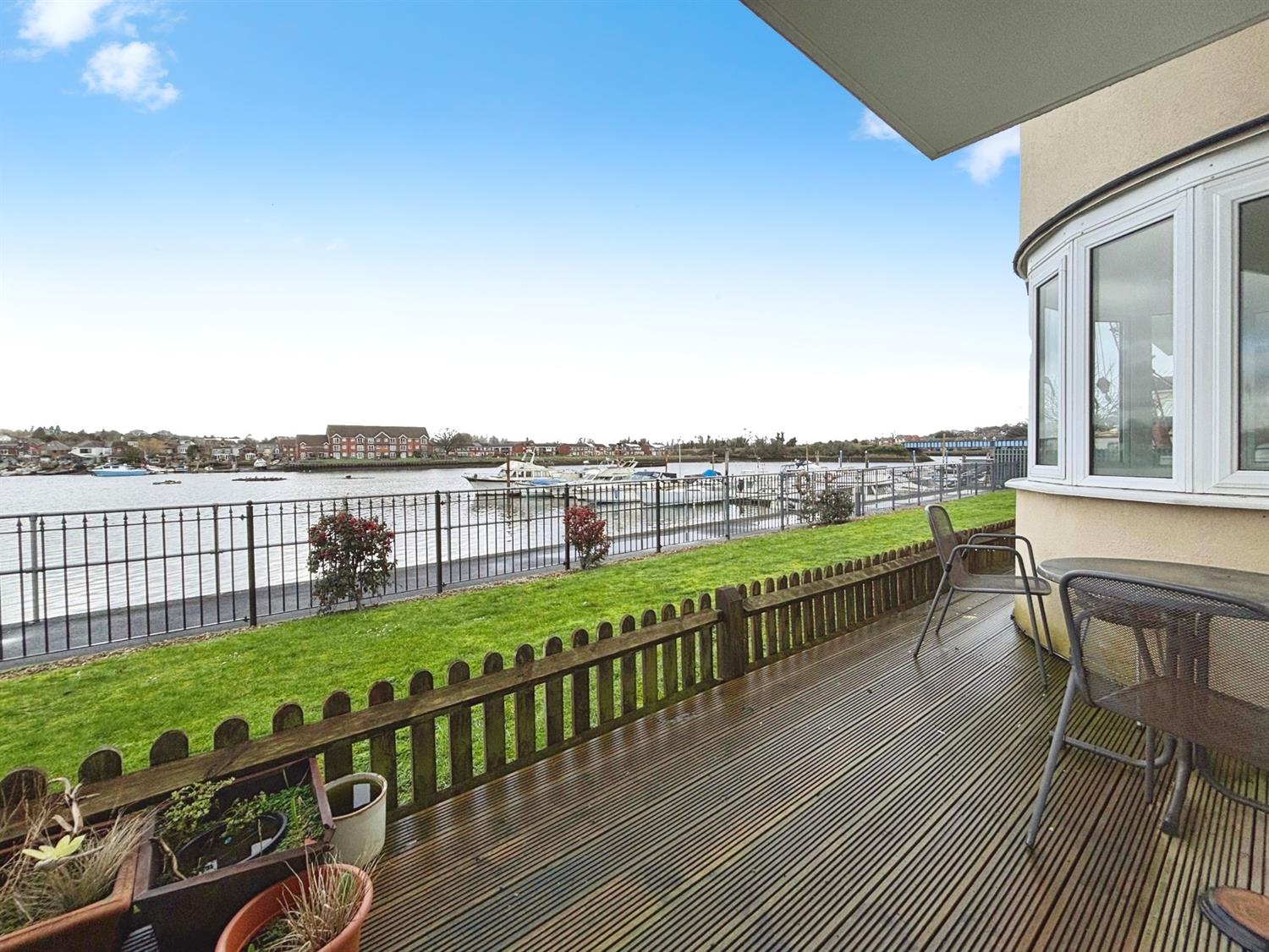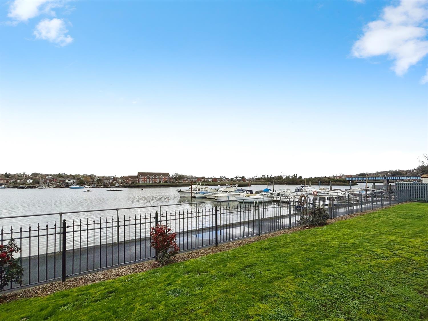 The property features an open-plan layout with solid wood flooring, combining the kitchen and living space to create a practical area for everyday living and entertaining. The kitchen benefits from natural light, an island and patio doors, enhancing the connection to the outside space. Both bedrooms are doubles; one enjoys views of the river, while the other has patio doors, adding further light and flexibility of use. There is one bathroom serving the flat. Parking is included, providing useful convenience in this riverside setting.
