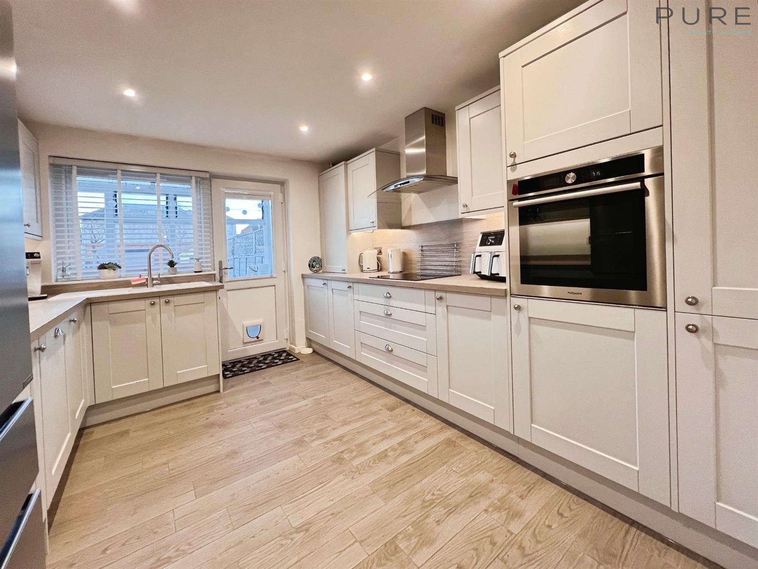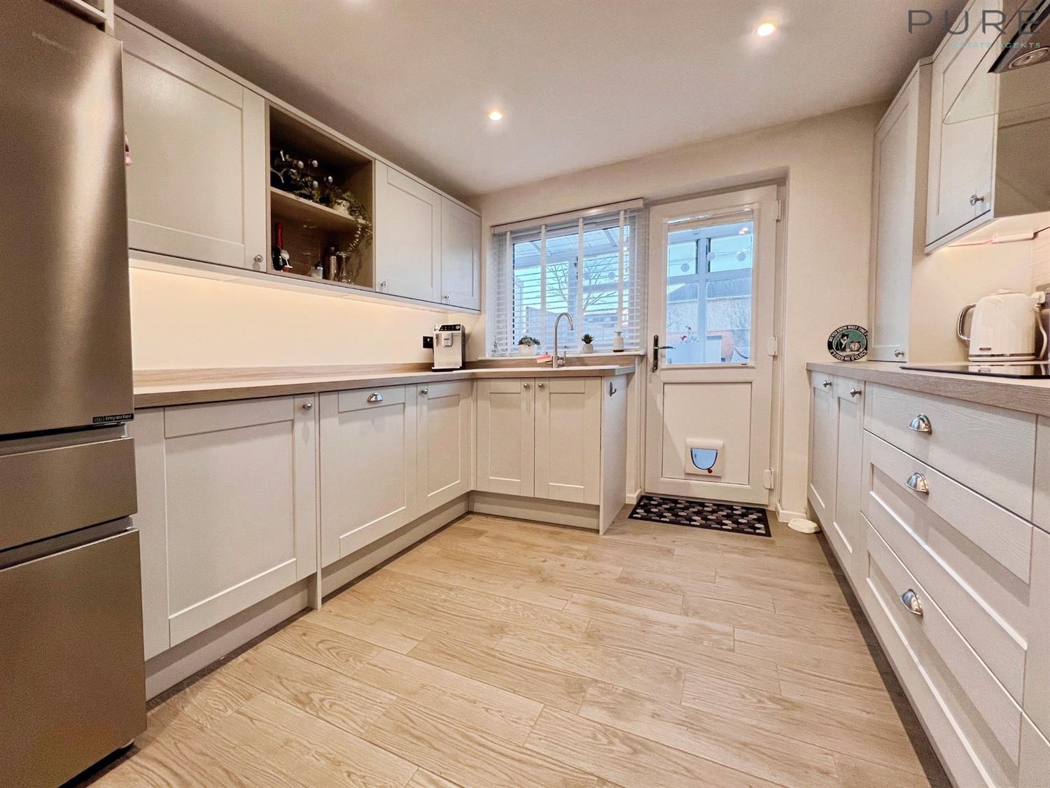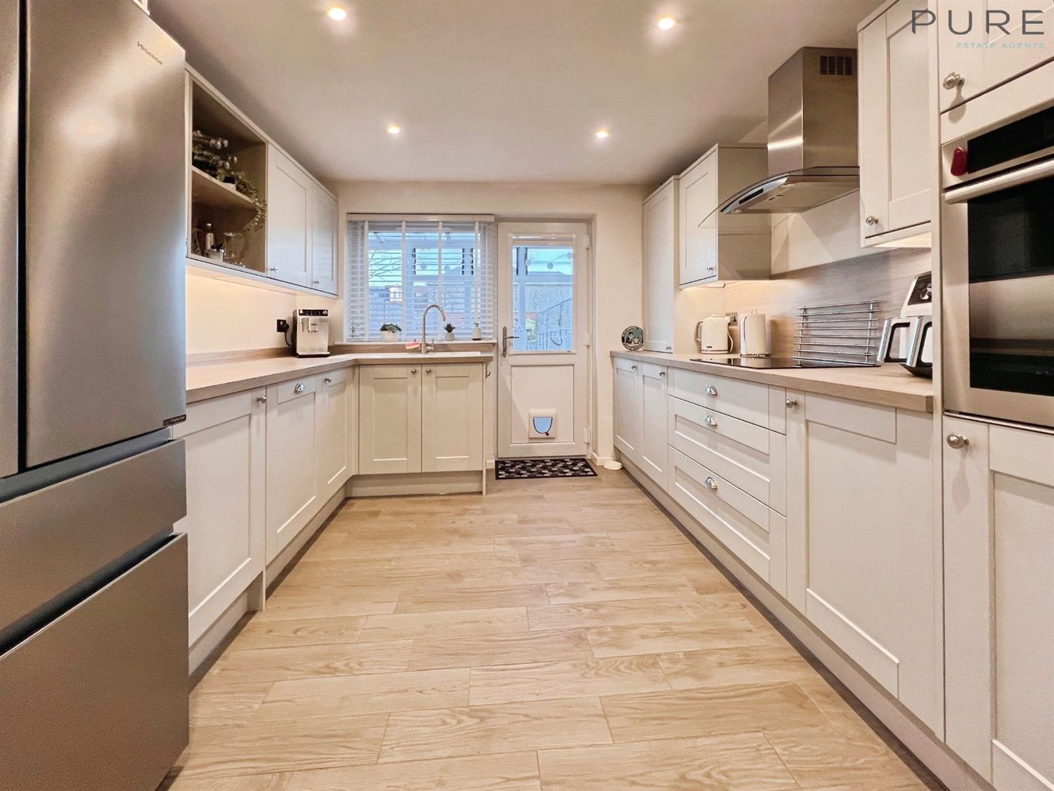 The ground floor features an open-plan reception room with large windows, creating a bright and flexible living and dining space. The modern kitchen benefits from good natural light and is fitted with an induction hob, integrated dishwasher and integrated washing machine, offering a practical and well-equipped cooking area. There is a conservatory to the rear offering stunning garden views.