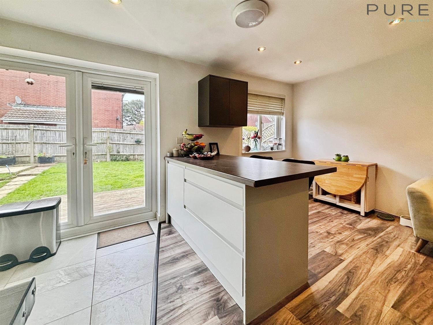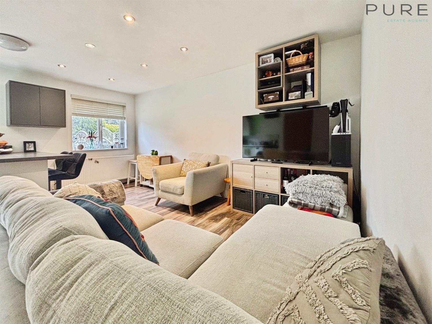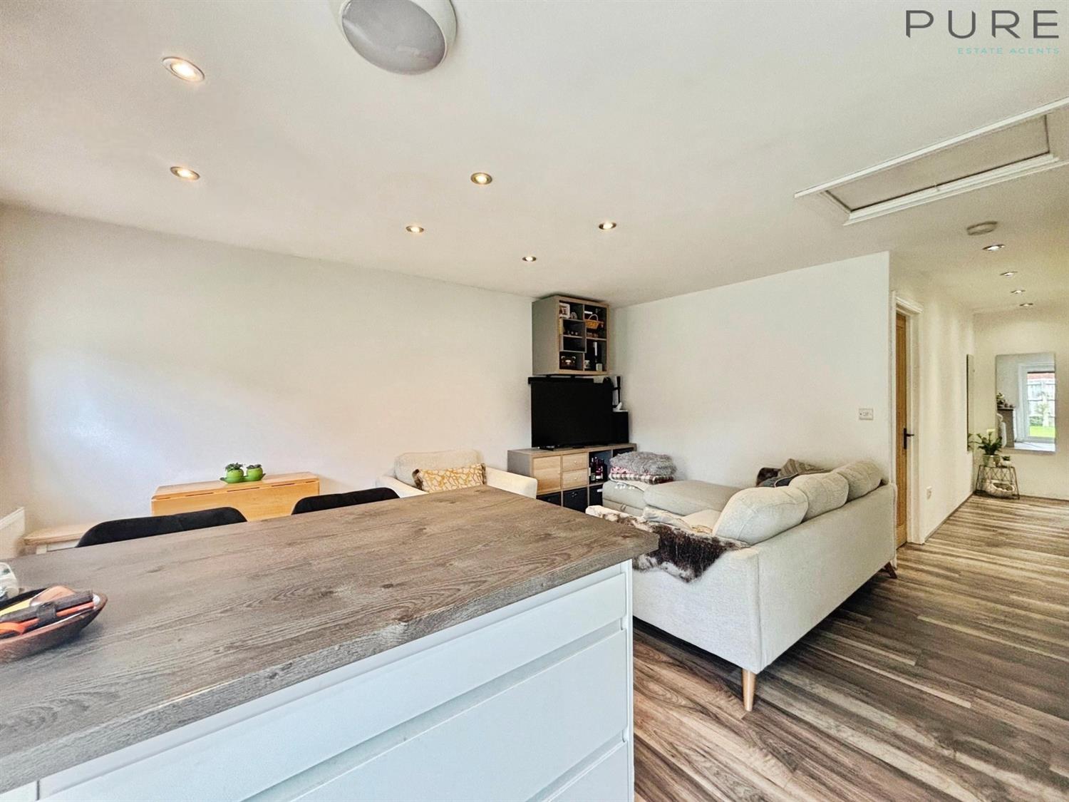 The heart of the property is an open-plan kitchen and reception space, designed to maximise natural light. The kitchen features a practical island, providing useful preparation and dining space, while the reception area offers a pleasant garden view and a sociable layout suited to modern living.