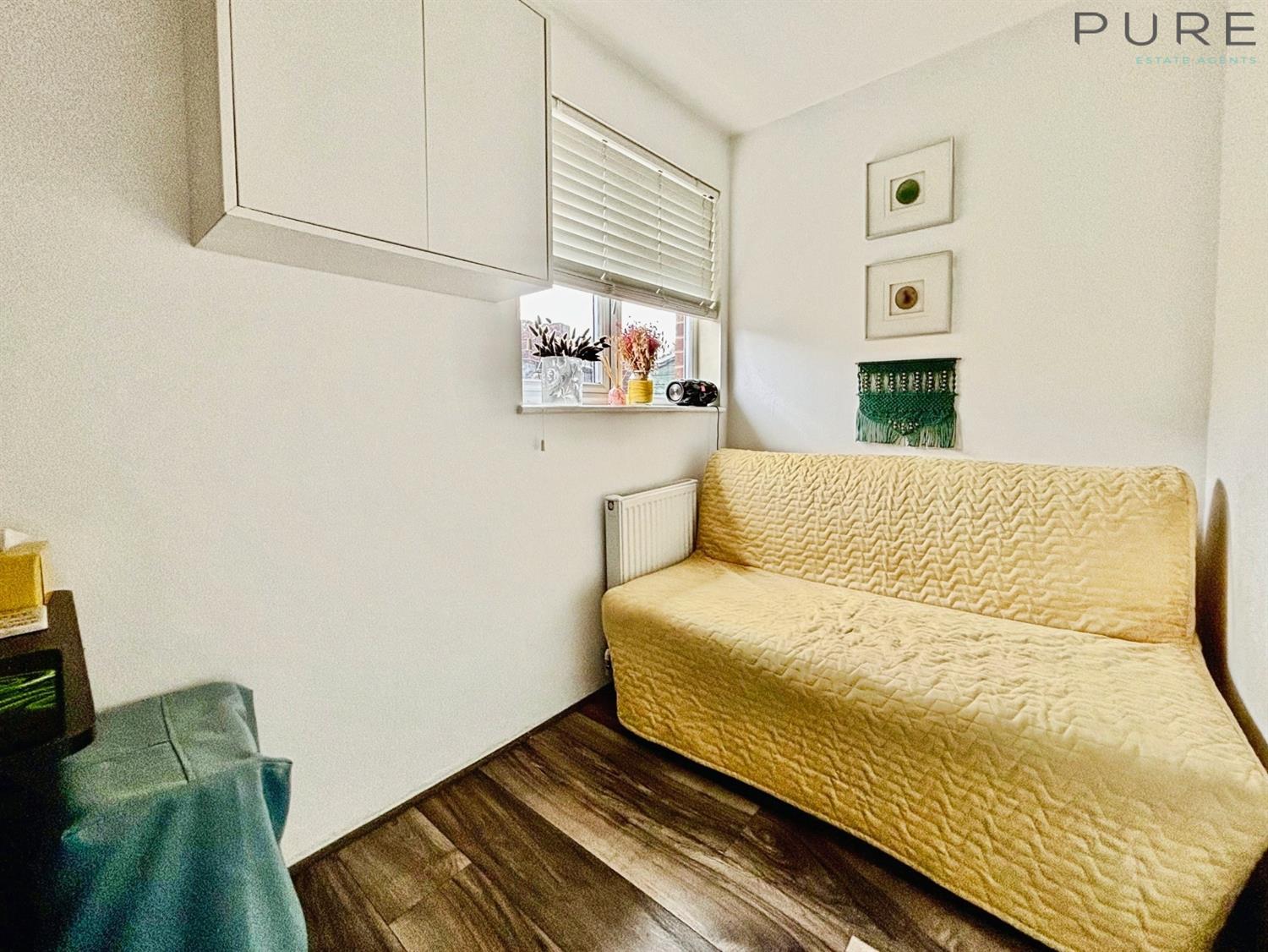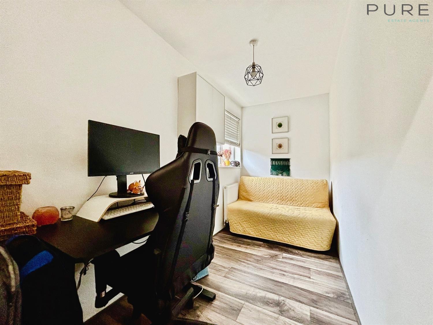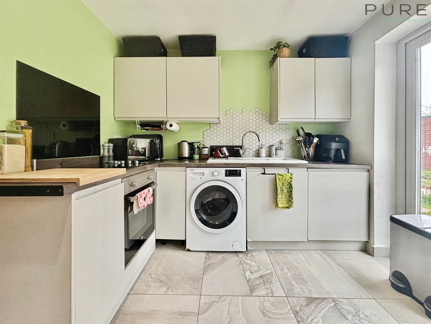 The heart of the property is an open-plan kitchen and reception space, designed to maximise natural light. The kitchen features a practical island, providing useful preparation and dining space, while the reception area offers a pleasant garden view and a sociable layout suited to modern living.